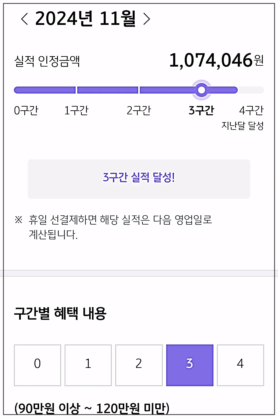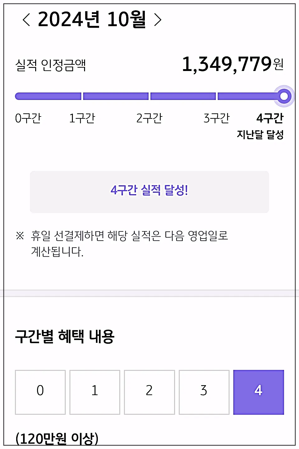 저는 10월 달에 120만 원 이상의 카드 결제 금액이 나왔기 때문에 다음 달인 11월에 4구간의 혜택을 받을 수 있습니다.