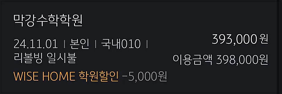 | 학원 5% 할인 | 학원 업종으로 등록된 가맹점만 적용 / 인터넷 강의, 직업훈련기관, 도서·교육용품 구매 제외 |