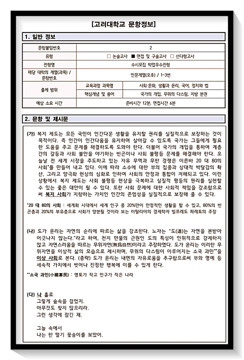 1가지 문항마다 아래와 같은 정보가 기록되어 있으니 고려대 제시문 기반 면접을 준비하는 학생은 참고하시면 좋을 듯합니다.