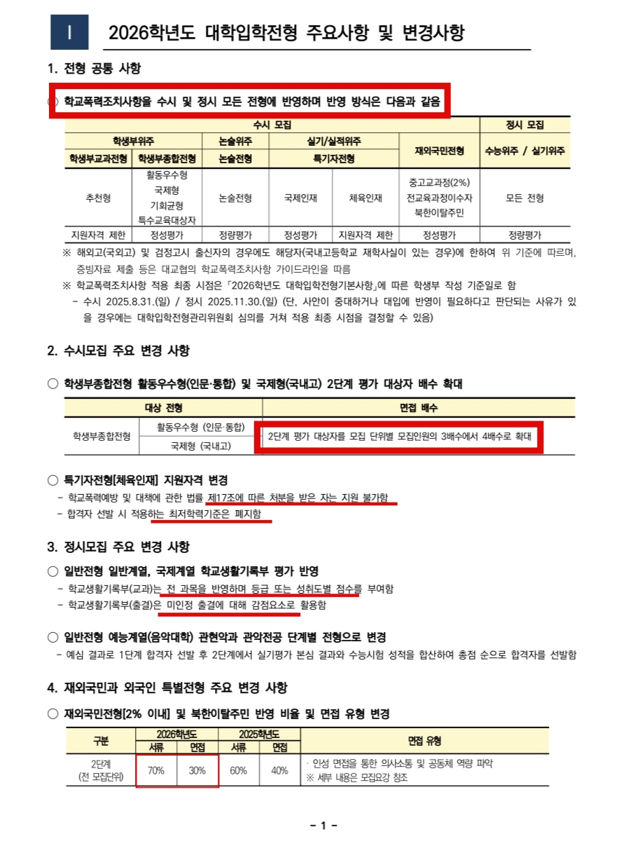 2026학년도 대학입학전형 주요 사항 및 변경사항