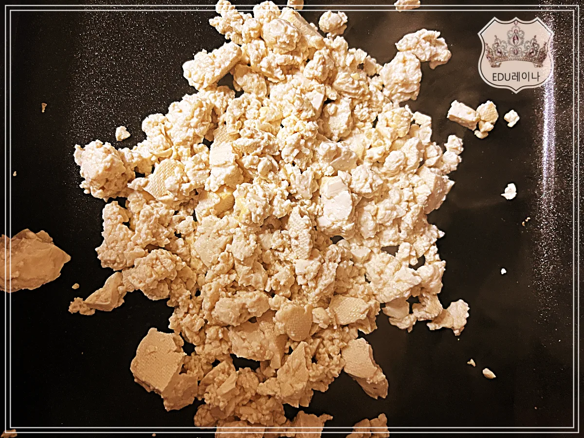 기름 두르지 않은 팬에 두부 넣고 으깨어 물기가 마를 때까지 볶으면 됩니다.