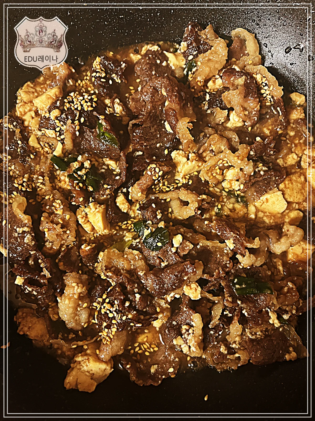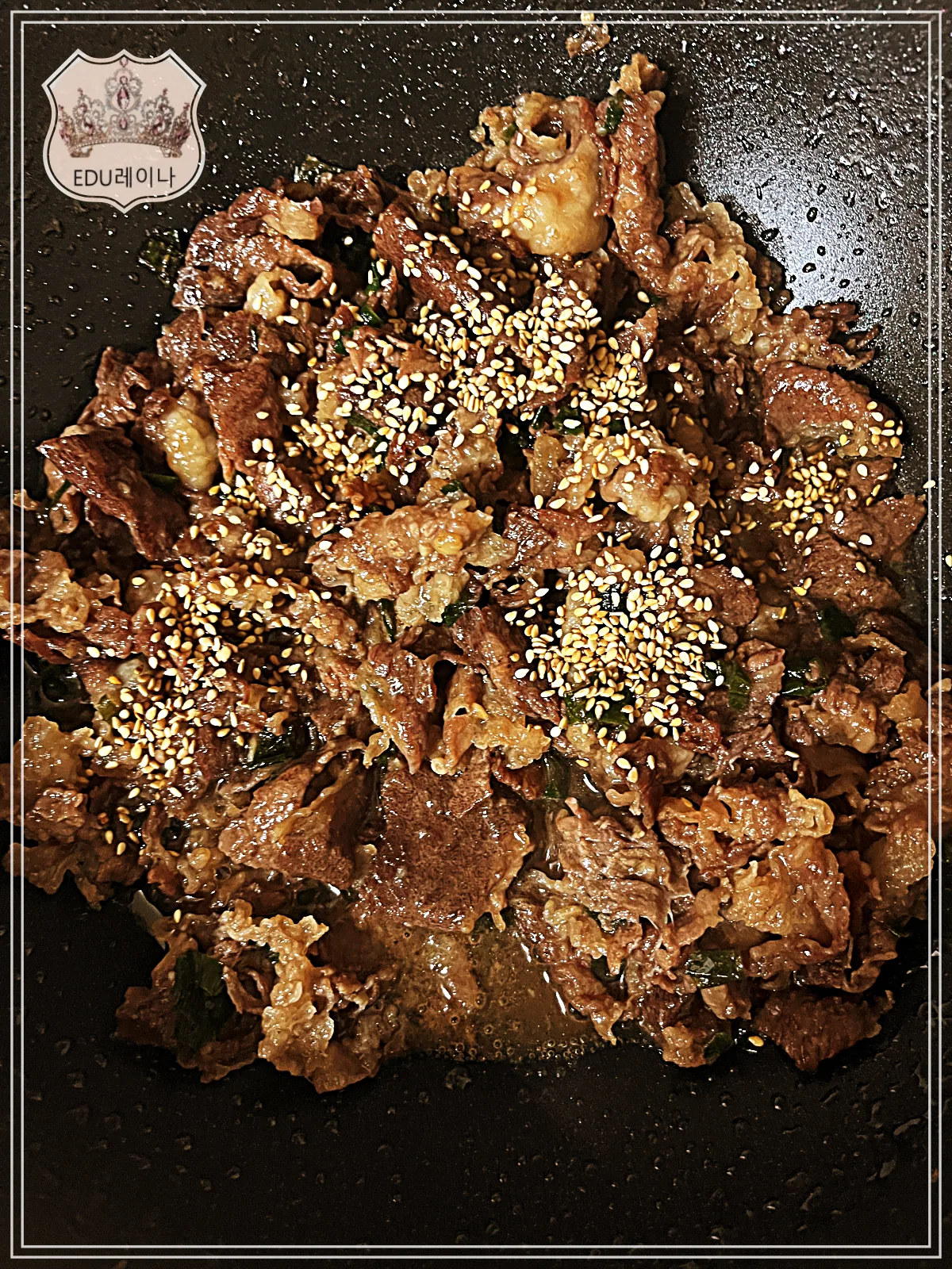 소스와 버무리면서 센 불에서 볶다가 깨를 뿌려 마무리합니다.