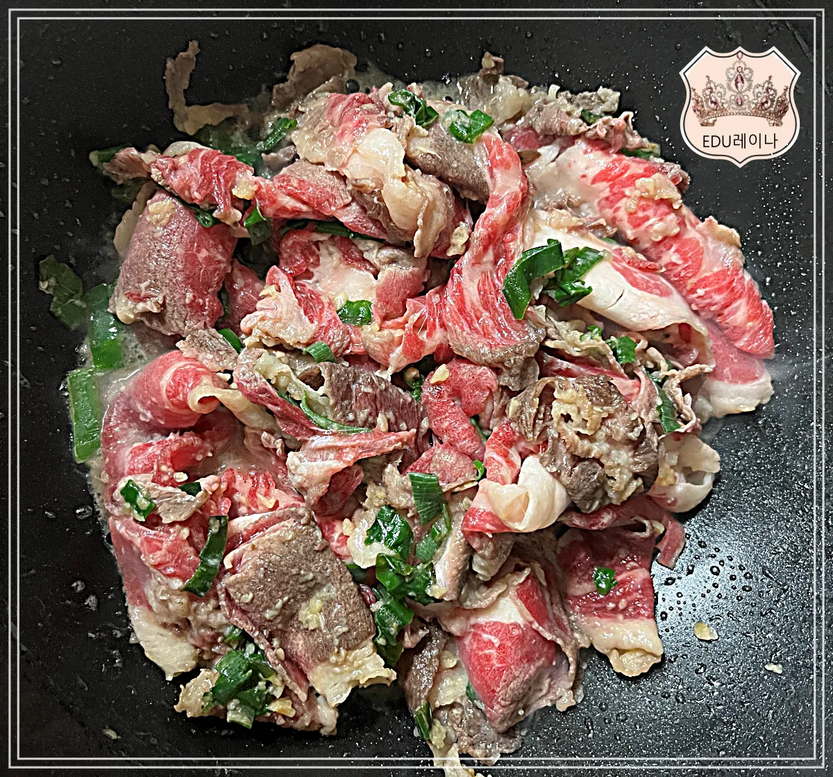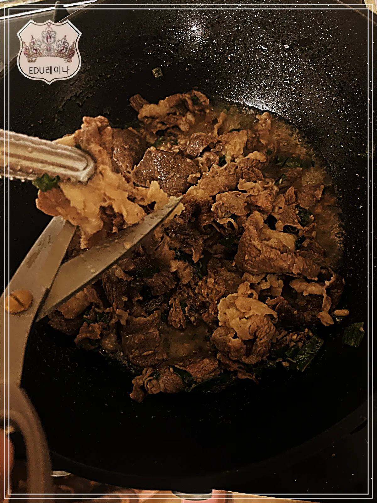 기름에 파, 마늘을 넣고 충분히 볶은 다음 차돌박이를 넣고 함께 볶습니다.