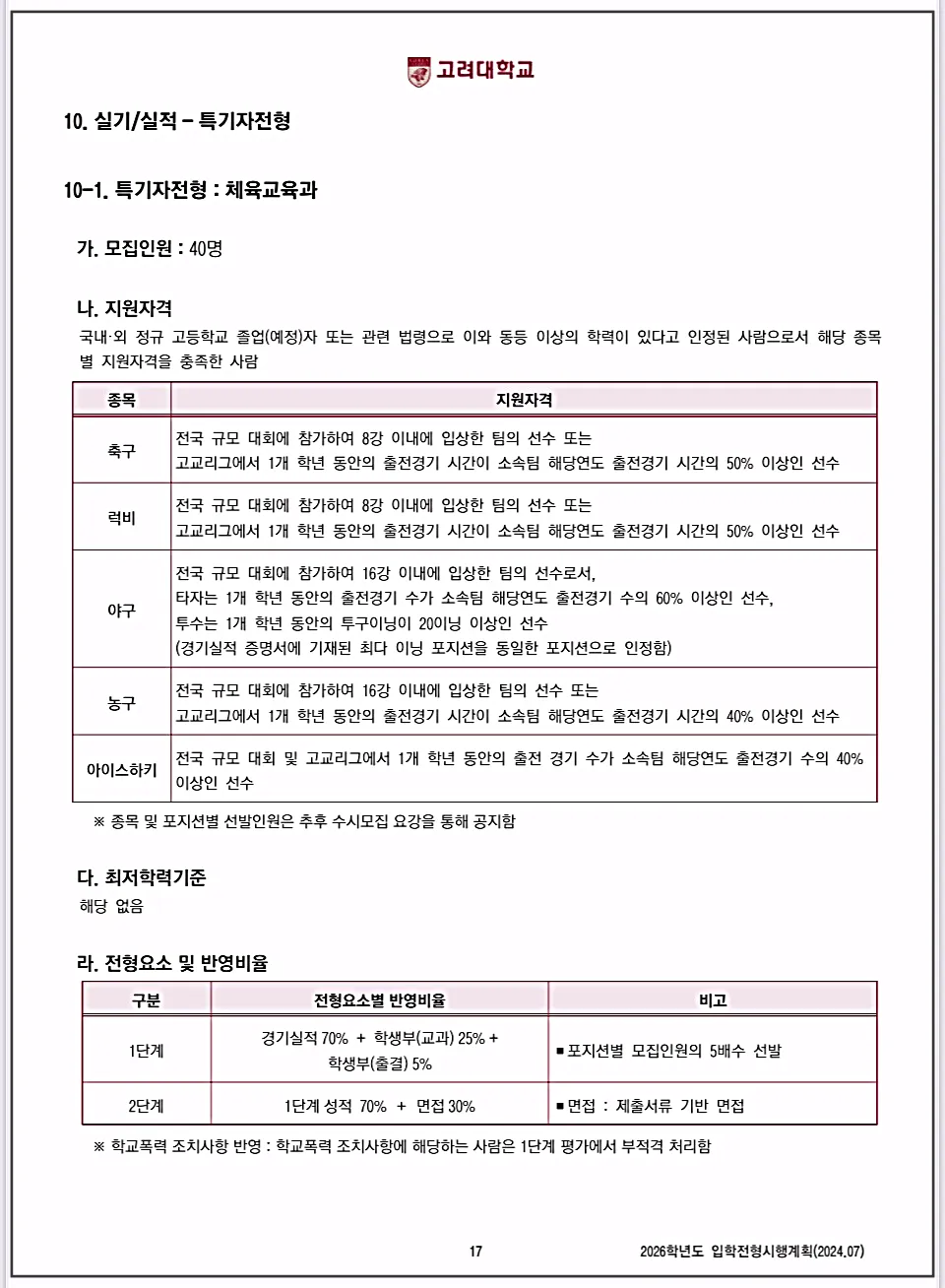 다른 학과는 서류평가를 정성평가로 평가방법을 변경하는데 반해 체육 관련학과는 1단계부터 부적격처리를 하니 유념하시기 바랍니다.