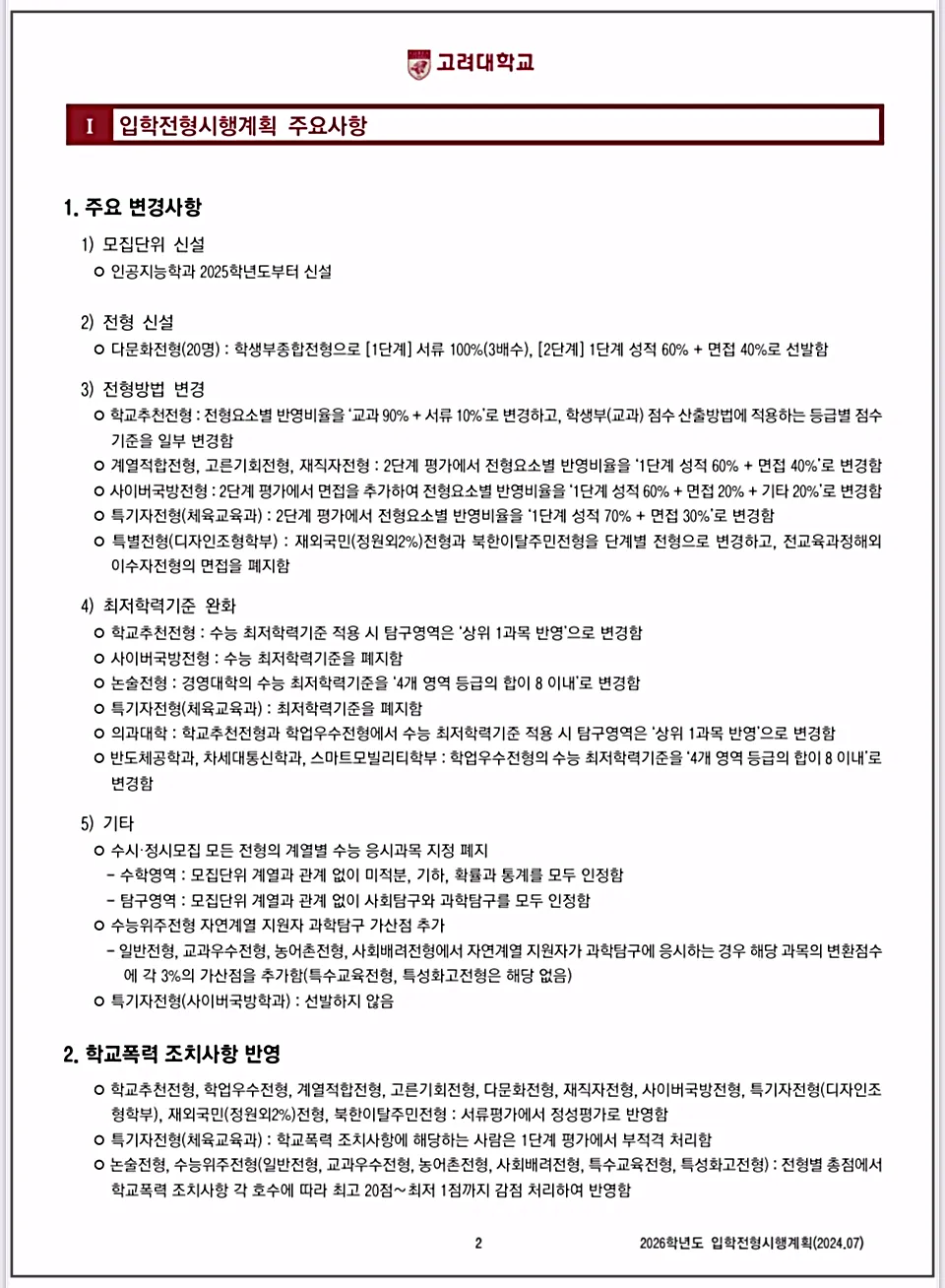 2026학년도 입학전형 주요 변경사항