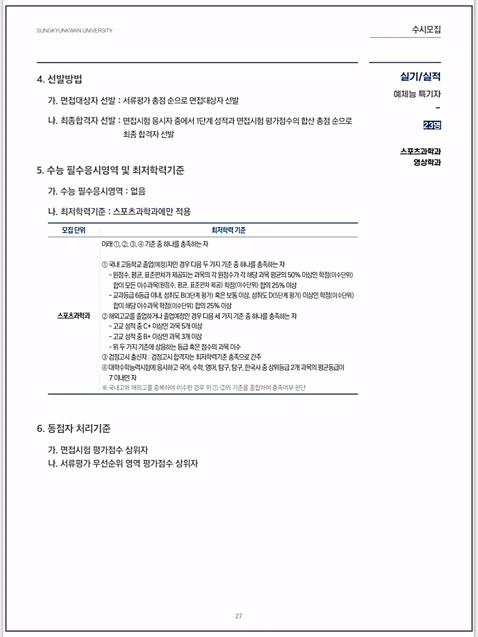 | 5. 수능 최저학력기준 확인 : 스포츠학과 있음 / 영상학과 없음 |