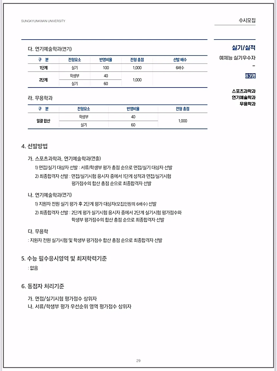 - 연기 - 1단계 : 실기 100 - 총점 1000 (모집인원 6 배수) / 2단계 : 학생부 40+실기 60