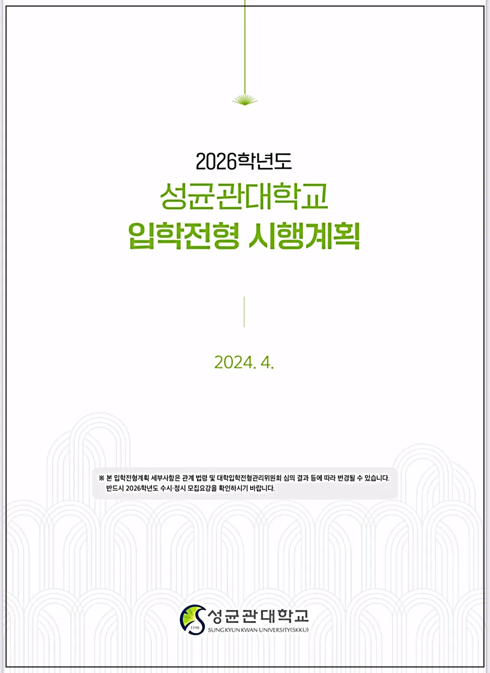성균관대 입학처 홈페이지를 살펴보면  '2026 성균관대학교 입학전형 시행계획' 자료가 올라와 있어요.