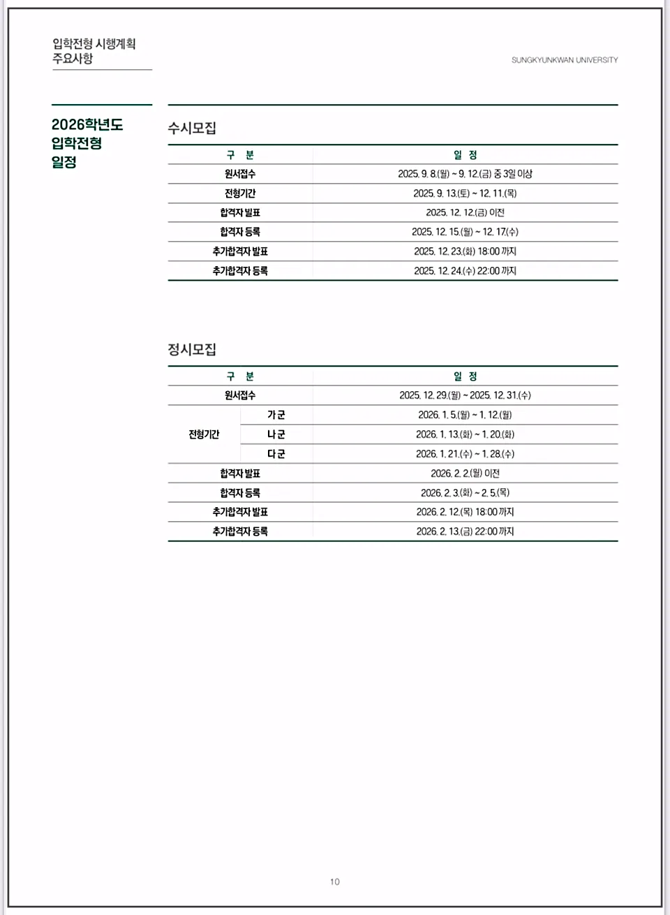 2026학년도 성균관대의 입학전형 일정을 참고하시어 다른 대학의 일정과 겹치지 않도록 주의하며 원서 접수 계획을 하시기 바랍니다.