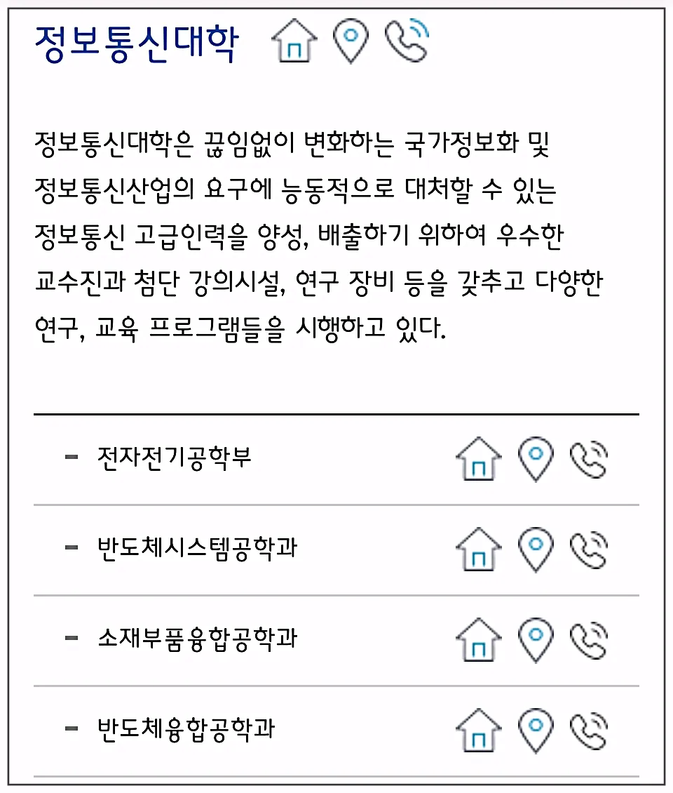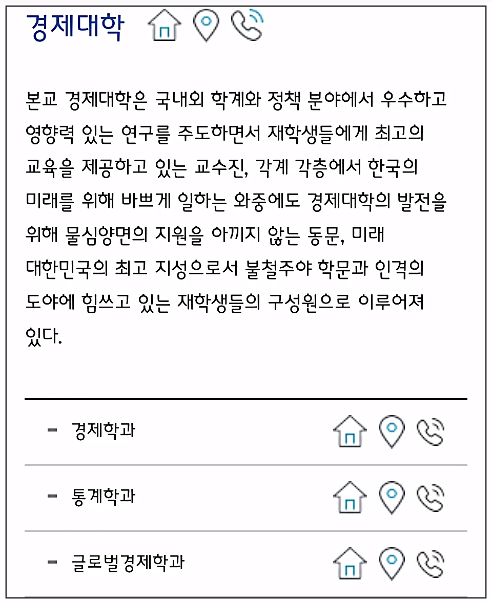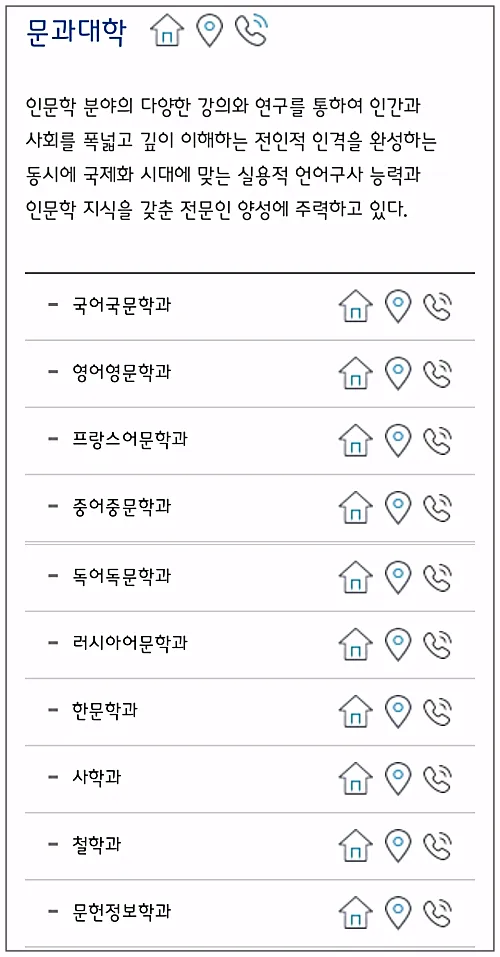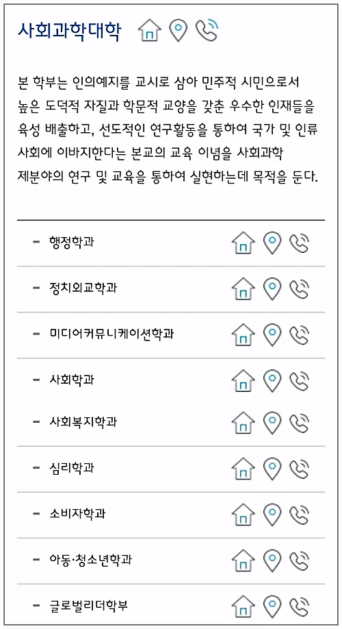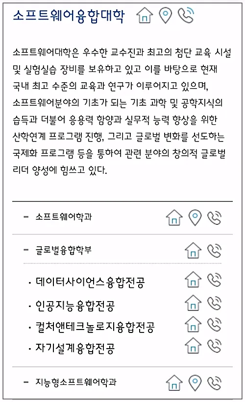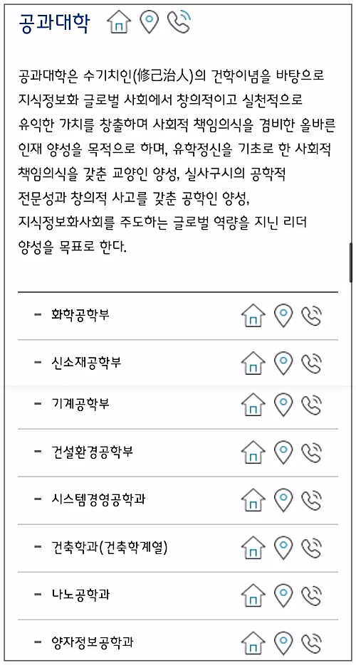 집모양 버튼을 누르시면 각 학과에 대한 상세페이지에 연결되는데요, 학과마다 구성이 각각 다르게 되어있더라고요.