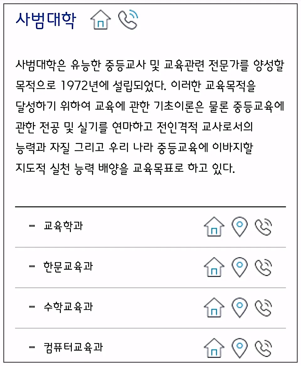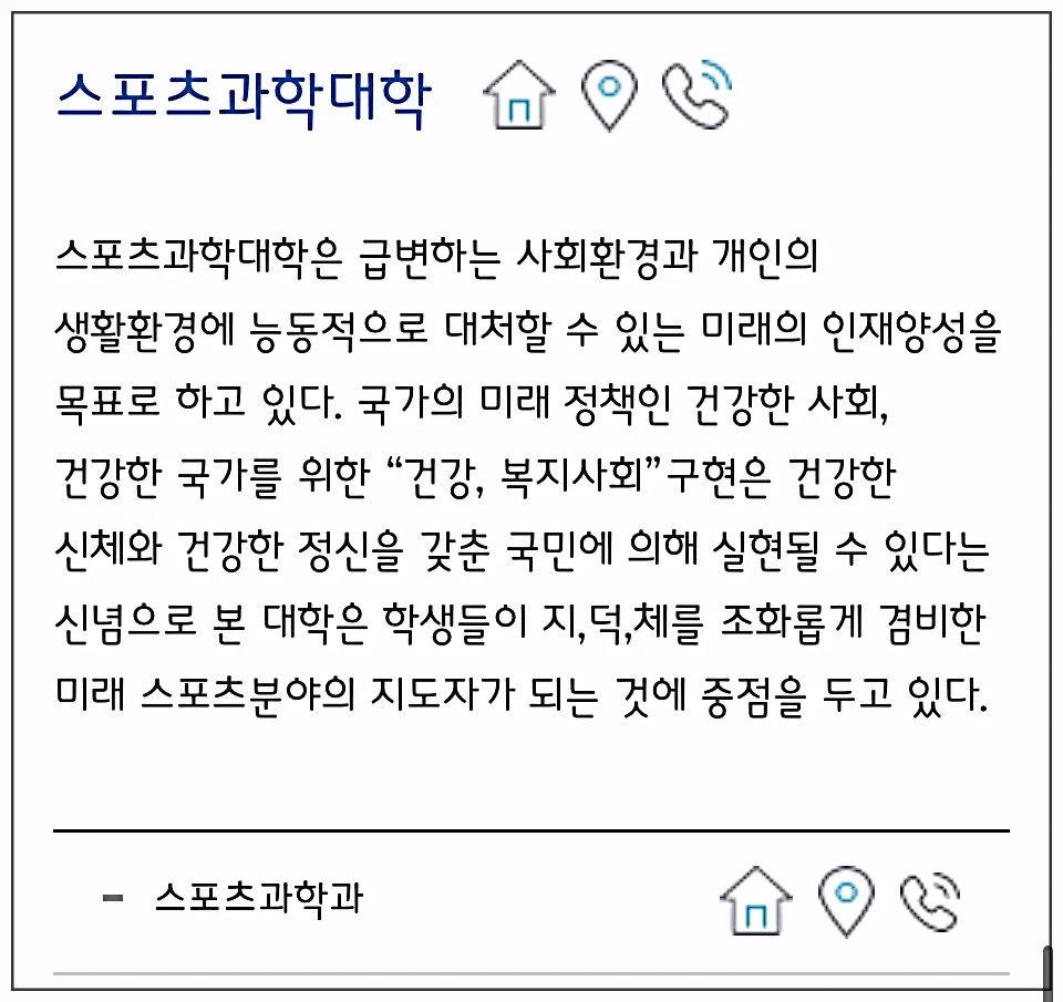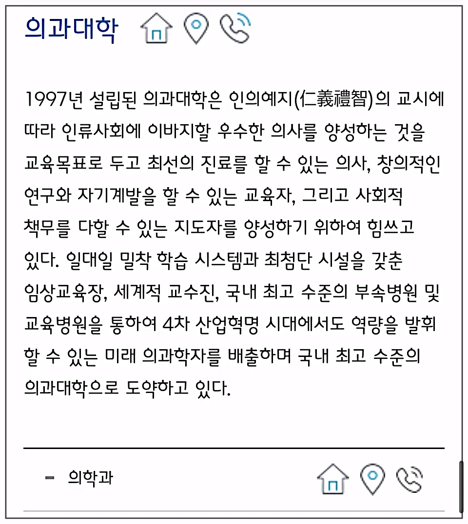 집모양 버튼을 누르시면 각 학과에 대한 상세페이지에 연결되는데요, 학과마다 구성이 각각 다르게 되어있더라고요.