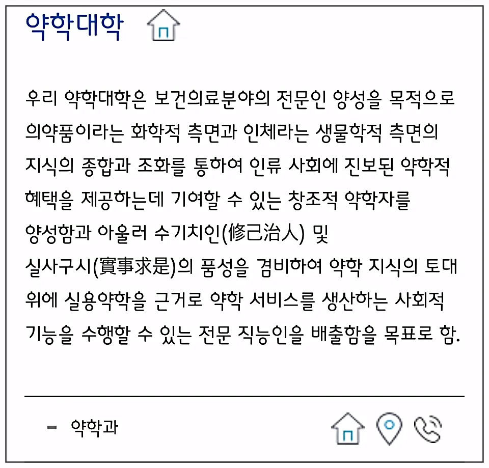 약학과는 인류사회에 진보된 약학적 혜택을 제공하는 것과 더불어 실용약학을 근거로 약학 서비스를 생산하는 전문 직능인을 배출함을 목표로 하고 있네요.