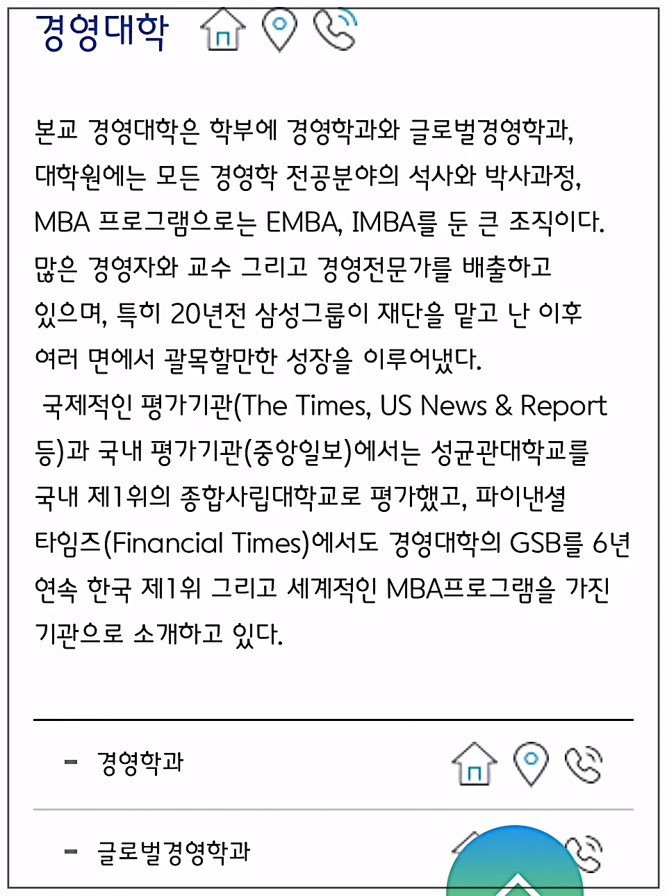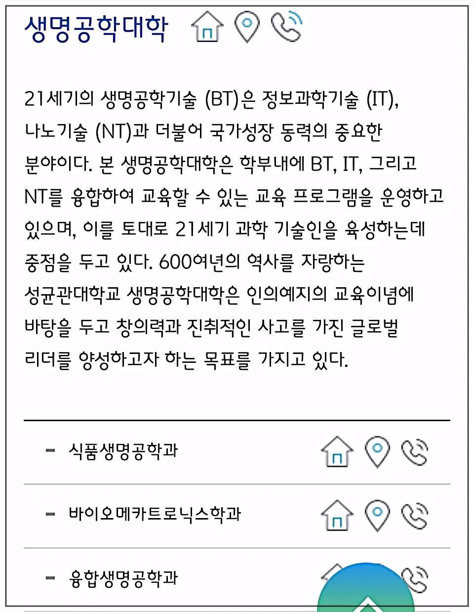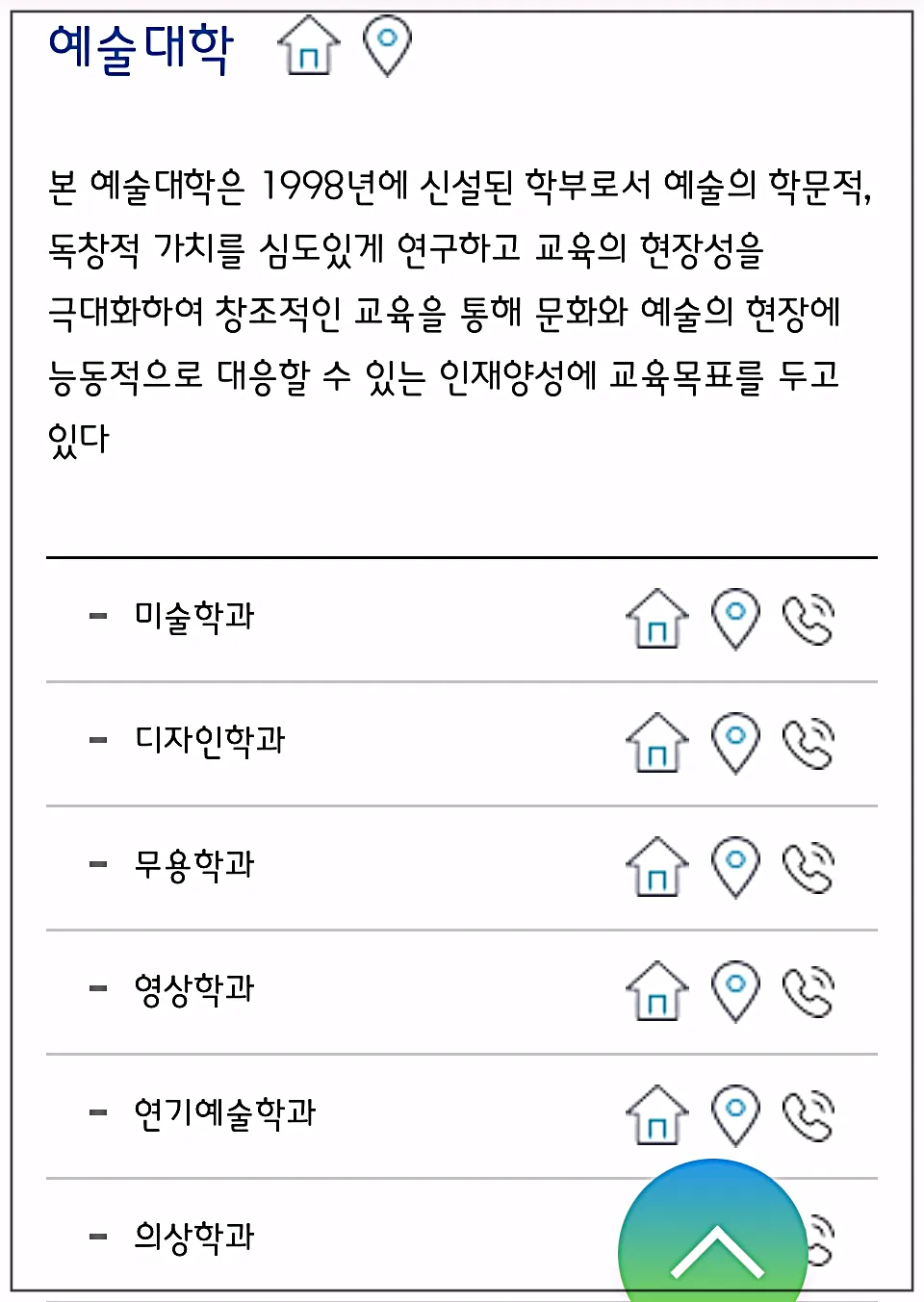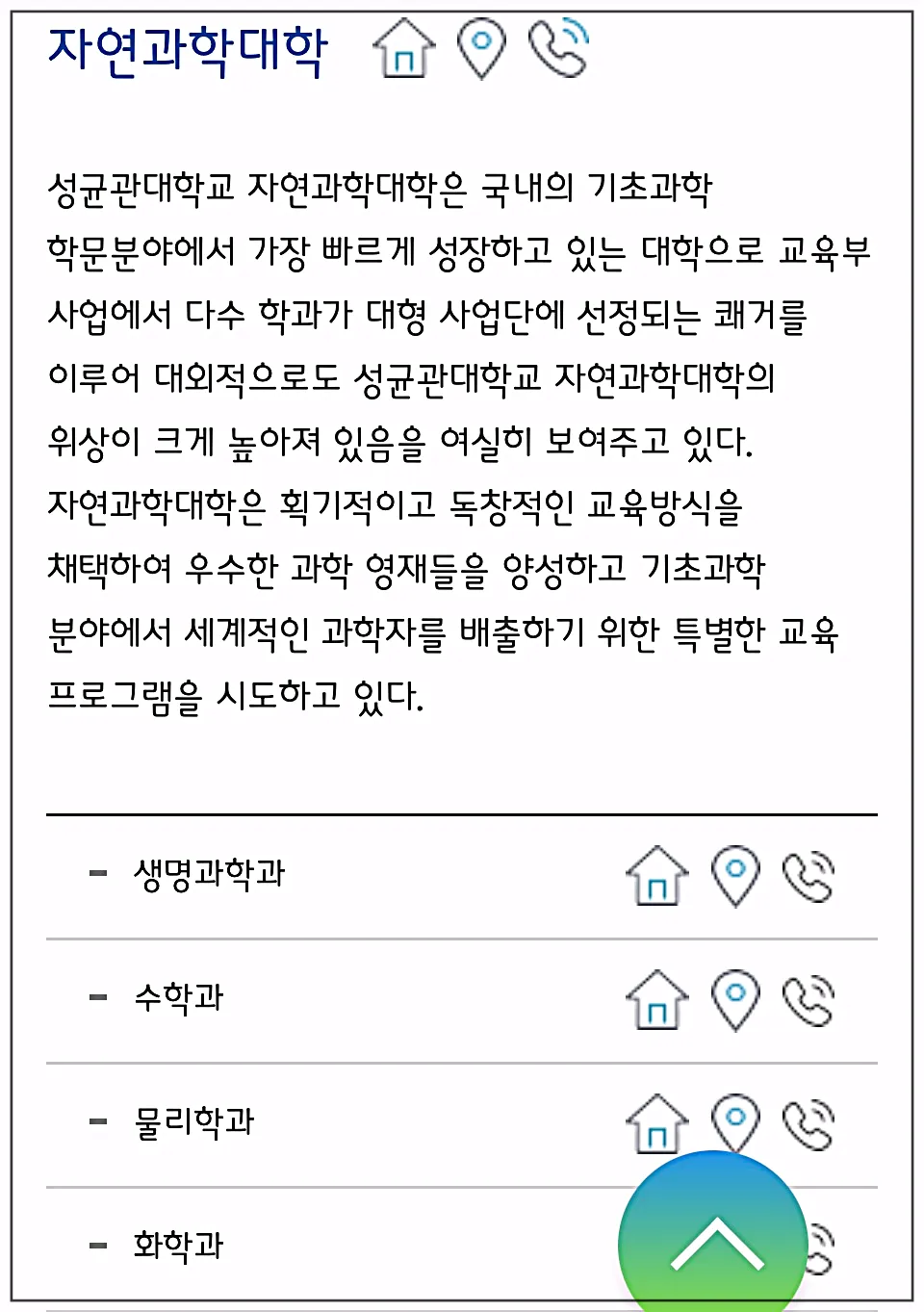 그리고 아래의 학과 설명 이미지를 보시면 학과마다 집모양의 버튼이 보이실 거예요.