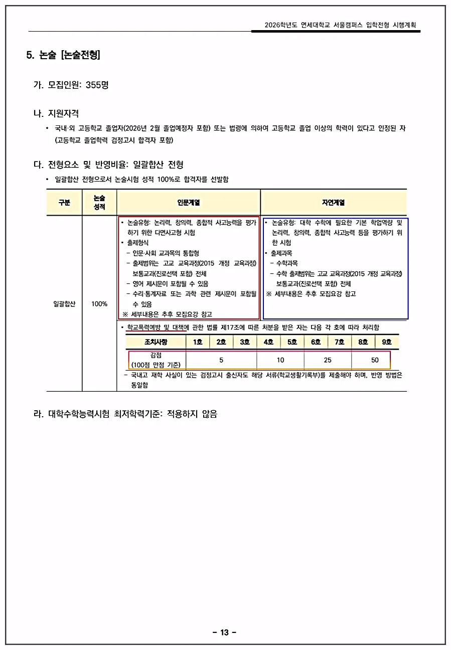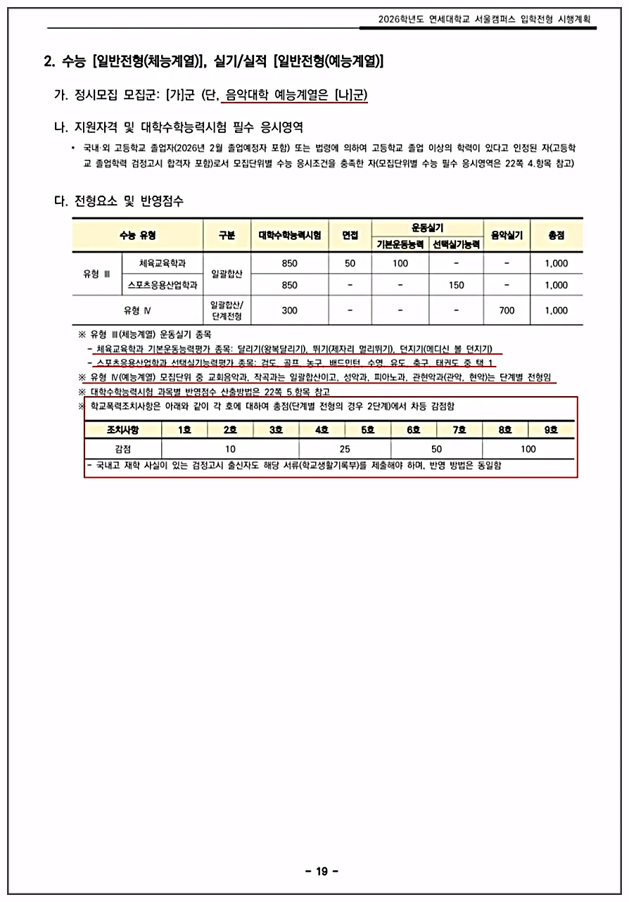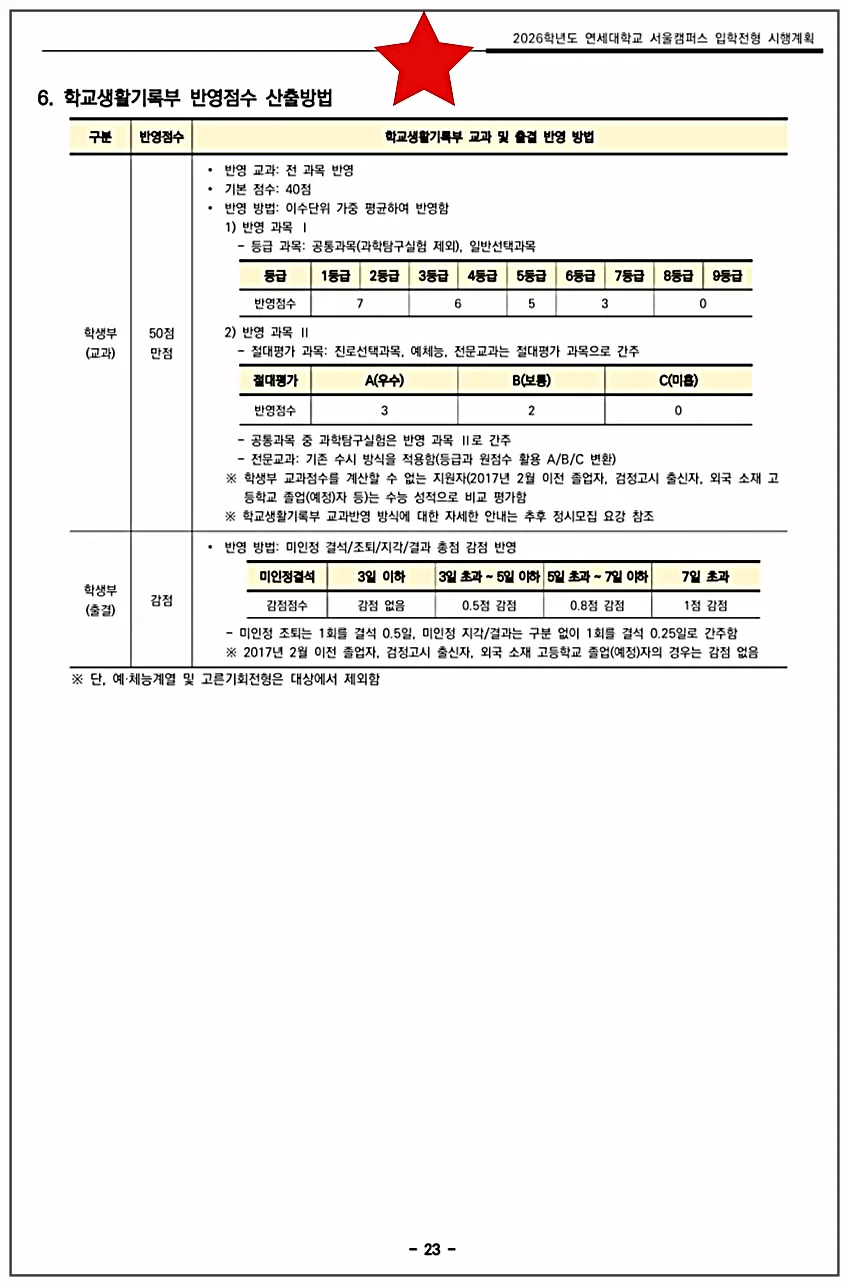 연세대학교의 입시 전형에서 가장 눈에 띄는 특징은 '학교폭력조치 대상자'에 대한 평가 방법을 따로 두었다는 점입니다.