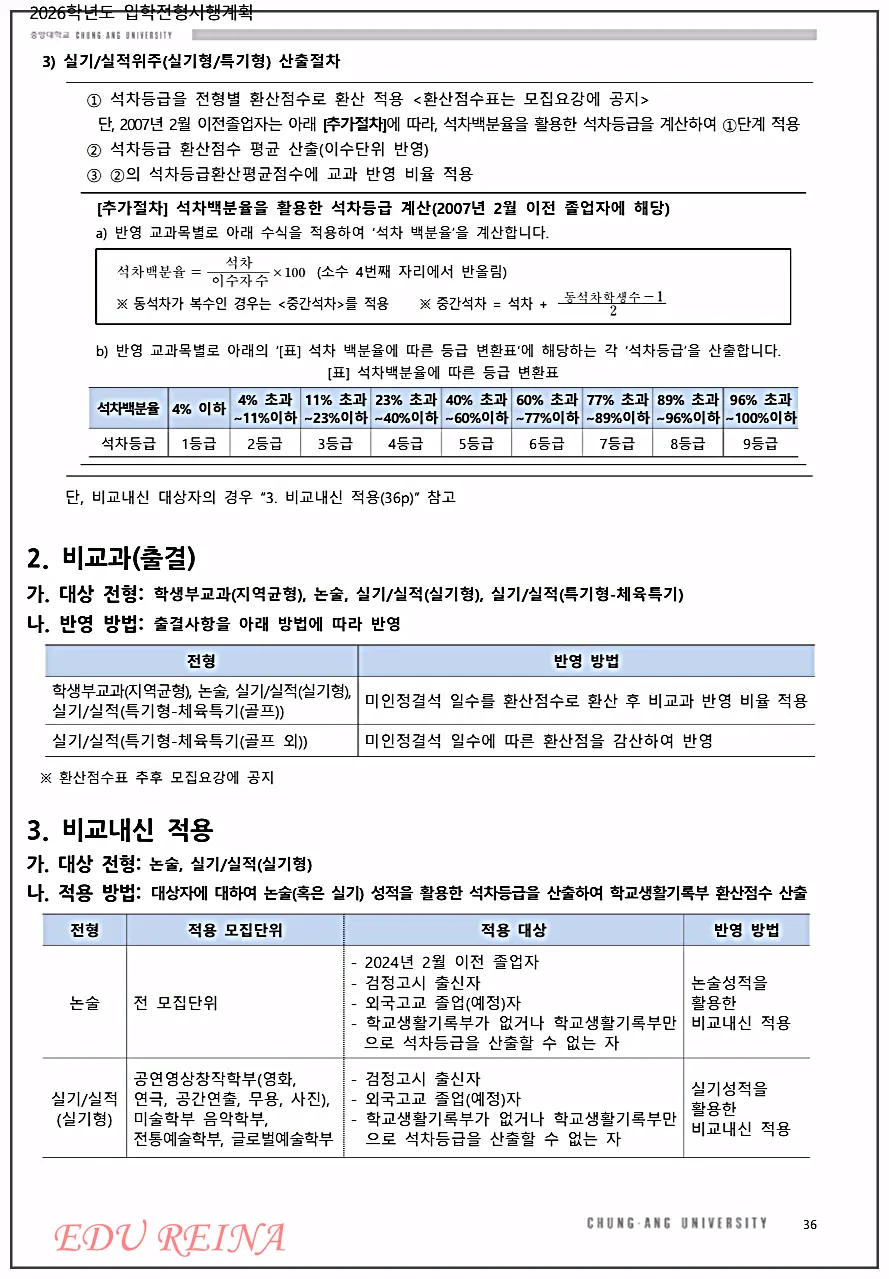 중앙대는 다른 대학들과 비교할 때 출결의 비중을 많이 두는 편인 것 같으니 적용되는 전형의 출결 반영 방법도 숙지해 두시길 권합니다.