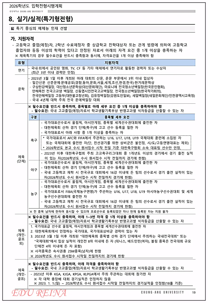 연기, 문학, 체육(단체, 개인) 중에서 해당되는 유형의 지원자격을 꼼꼼히 살펴보시기 바랍니다.
