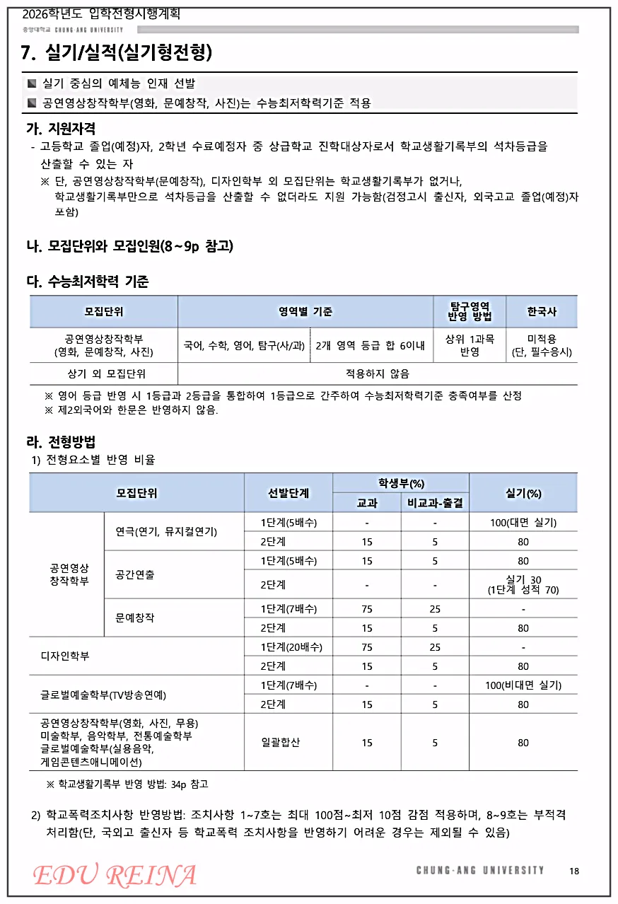 공연영상창작학부의 최저 수능 적용은 작년과 다르게 2026학년도 입시에 변경된 사항이니 꼭 체크해 두세요.