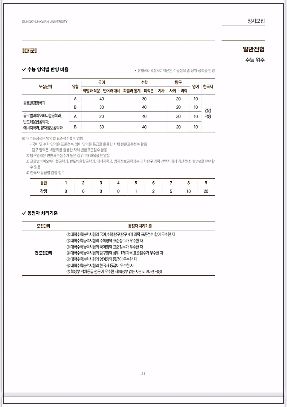 - 자연과학계열, 전기전자공학부, 공학계열 소프트웨어학과, 반도체융합공학과, 에너지학과, 양자정보공학과는 과학탐구 선택자에게 가산점 최대 5% 부여